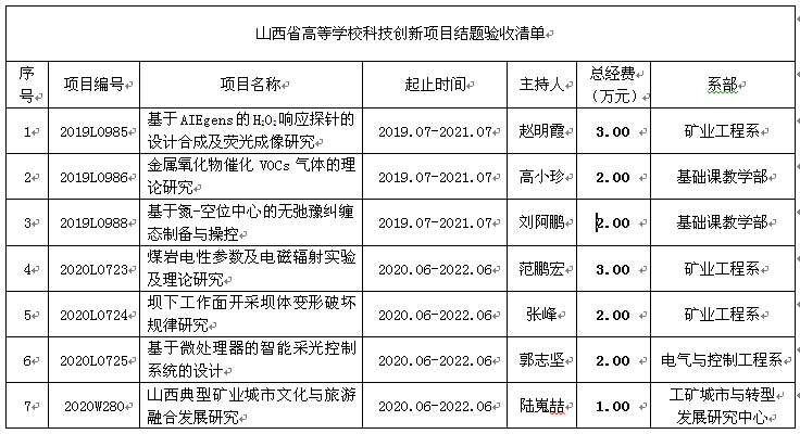 2022年5月25日上午9点,在行知楼313室进行山西省高等学校科技创新项目结题验收评审,相关专家对ac米兰2019-2020年度承担的山西省高等学校科技创新项目进行评审验收。评审验收会议由ac米兰官方网站科研工作部张润平部长主持,评审专家有:发展规划部王智庆教授、基础课教学部许丽副教授、土木工程系梁利生副教授、矿业工程系秦冬冬博士、电气与控制工程系王霞博士。