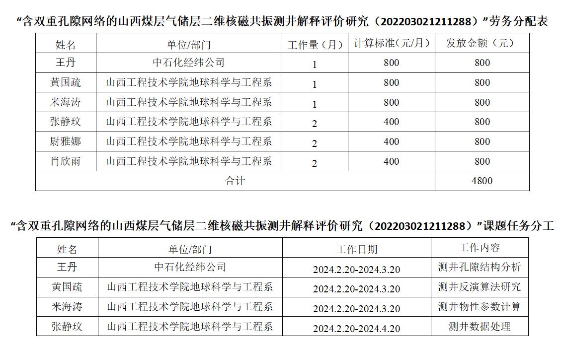 根据《ac米兰官方网站科研项目劳务费管理细则(试行)》(校科〔2019〕4号)的管理规定,现申请将刘亮负责的项目“含双重孔隙网络的山西煤层气储层二维核磁共振测井解释评价研究(202203021211288)”中的劳务费发放情况进行公示,具体金额如下: