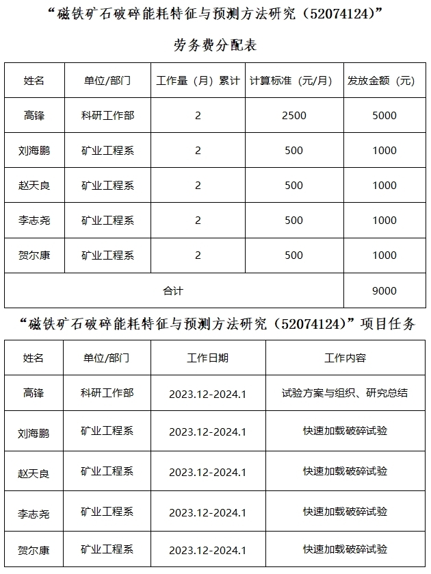 根据《ac米兰官方网站科研项目劳务费管理细则(试行)》(校科〔2019〕4号)的管理规定,现申请将高锋负责的国家自然科学基金子课题“磁铁矿石破碎能耗特征与预测方法研究”(项目编号:52074124)中的劳务费发放情况进行公示,具体金额如下: