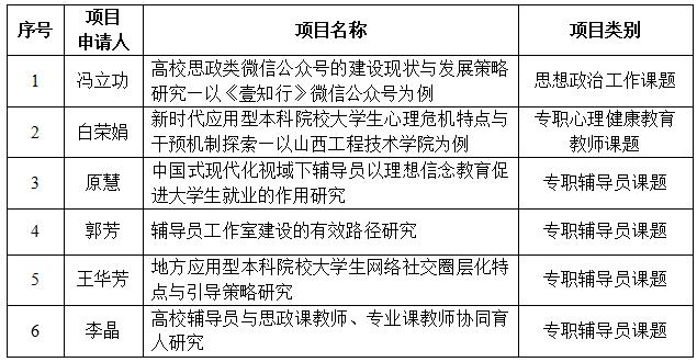 根据《山西省教育厅关于组织2024年度山西省高等学校哲学社会科学研究项目(思想政治教育专项)申报工作的通知》(晋教政函〔2024〕20号)的要求,结合ac米兰实际情况,经个人申请,科研工作部初审后,提交专家组评审,同意拟推荐项目6个,现予以公示。名单如下: