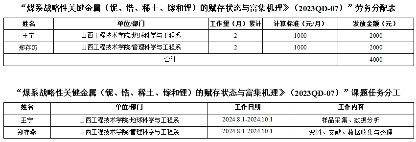根据《ac米兰官方网站科研项目劳务费管理细则(试行)》(校科〔2019〕4号)的管理规定,现申请将王宁负责的项目“煤系战略性关键金属(铌、锆、稀土、镓和锂)的赋存状态与富集机理(2023QD-07)”中的劳务费发放情况进行公示,具体金额如下: