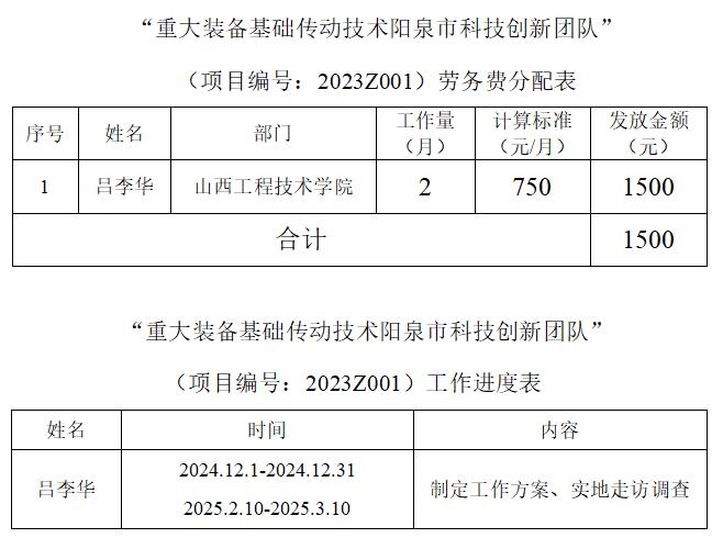 根据《ac米兰官方网站科研项目劳务费管理细则(试行)》(校科〔2019〕4号)的管理规定,现申请将王建梅负责的项目《重大装备基础传动技术阳泉市科技创新团队》(项目编号:2023Z001)中的劳务费发放情况进行公示。具体金额如下: