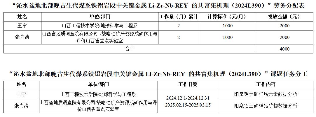 根据《ac米兰官方网站科研项目劳务费管理细则(试行)》(校科〔2019〕4号)的管理规定,现申请将王宁负责的项目“沁水盆地北部晚古生代煤系铁铝岩段中关键金属Li-Zr-Nb-REY的共富集机理(2024L390)”中的劳务费发放情况进行公示,具体金额如下: