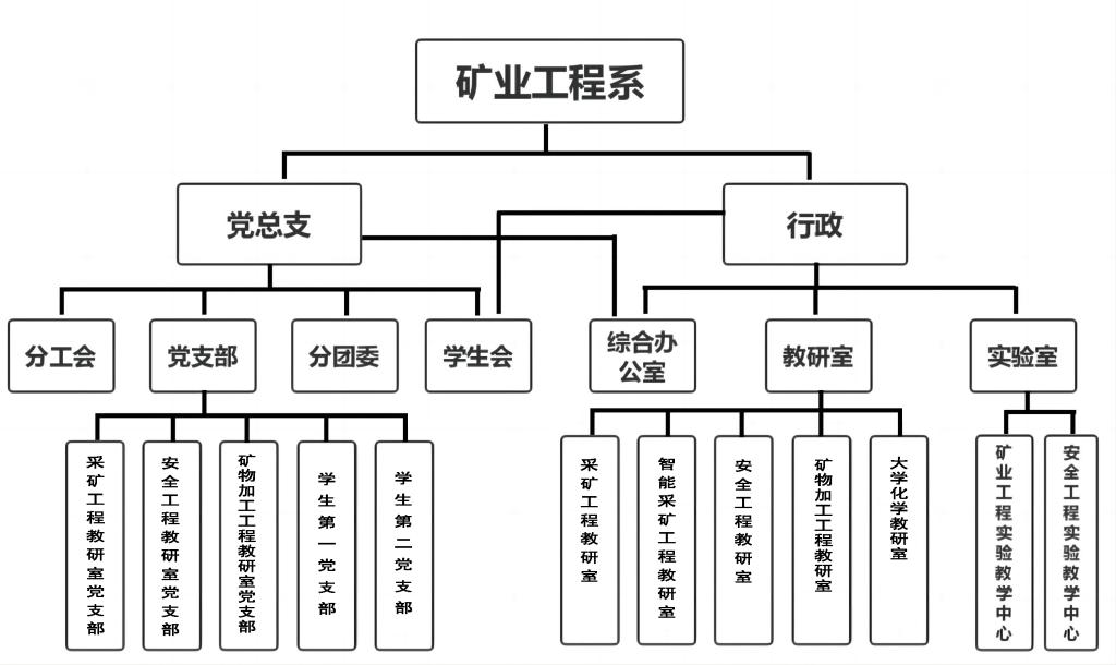 矿业工程系党总支下设机构有:采矿工程教研室党支部、安全工程教研室党支部、矿物加工工程教研室党支部、学生第一党支部、学生第二党支部、分工会、分团委、学生会等机构。