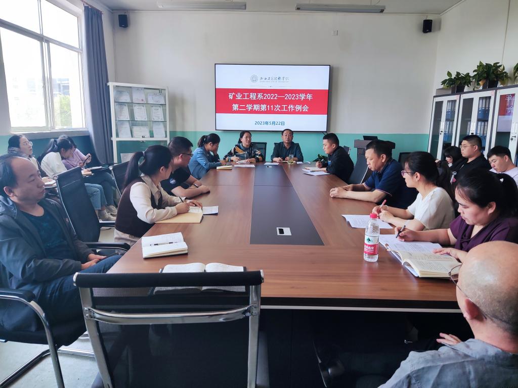 系主任赵明霞传达了赴大同大学的调研情况,分析部署了智能采矿工程专业和硕士学位授予立项建设单位申报、人才培养方案执行落实、省专利奖申报、毕业答辩等工作。党总支副书记史娇安排了学生党员发展、辅导员心理健康教育培训、安全稳定、学生请销假、新生辅导员遴选、考风考纪和毕业生就业及离校工作。系副主任张峰重点部署了实习和毕业设计工作。王旭宏结合考试和毕业答辩安排了清廉学校建设工作,部署了第二次教代会提案工作,重点强调了学生请假、考风考纪和工作纪律问题。