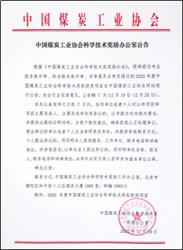 中国煤炭工业协会科学技术进步二等奖获奖公示