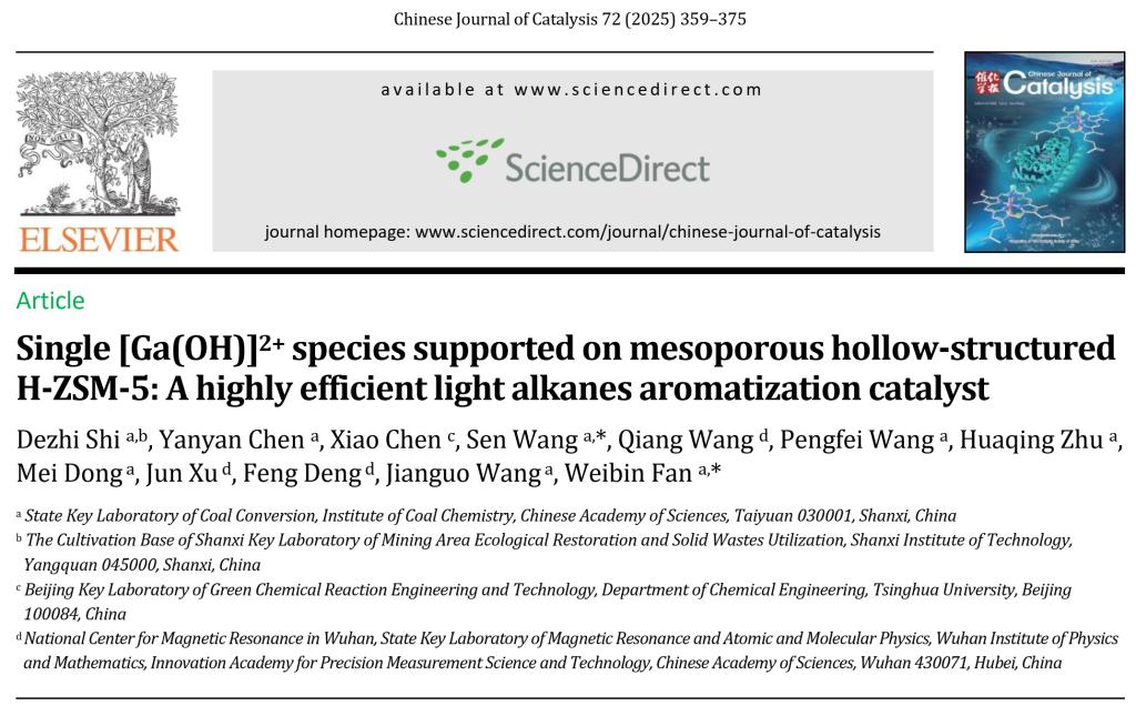 近日,我系石德志博士在催化化学领域国际顶级期刊《Chinese Journal of Catalysis》发表低碳烷烃芳构化领域的最新研究成果。该工作报道了一种微孔-介孔-大孔结构ZSM-5分子筛负载单一[Ga(OH)]2+物种催化剂可以高效地将低碳烷烃定向转化为以苯、甲苯和二甲苯为主的轻质芳烃。论文第一作者为石德志博士,论文合作单位有中国科学院山西煤炭化学研究所、ac米兰官方网站、清华大学和中国科学院精密测量科学与技术创新研究院。