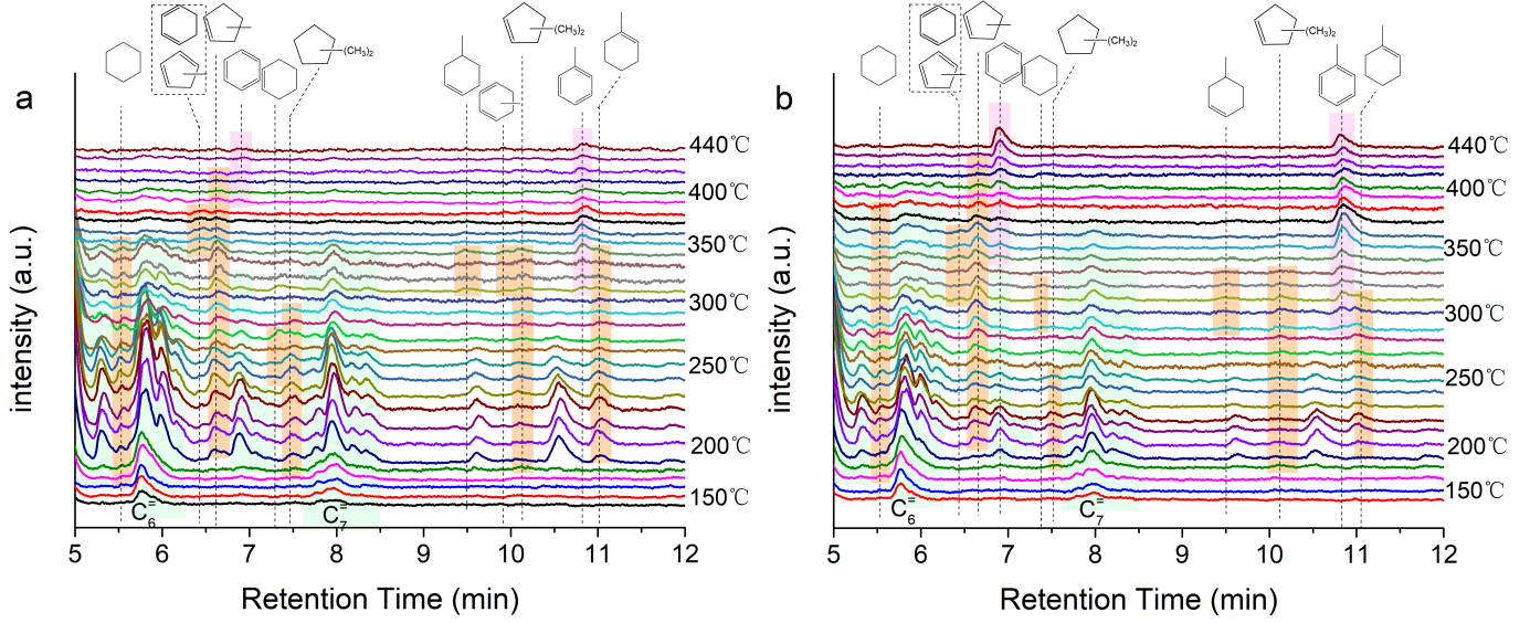 图5. H-ZSM-5 (a)与Ga-MH-ZSM-5催化剂(b)上的程序升温表面反应研究。(论文中出现的Figure 8)