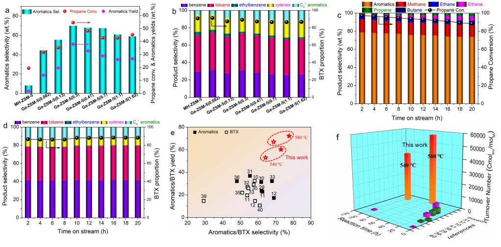 图2. (a, b, c, d) Ga-MH-ZSM-5催化剂的性能评价结果;(e, f) 本文的催化剂性能与文献对比图。(论文中出现的Figure 3)