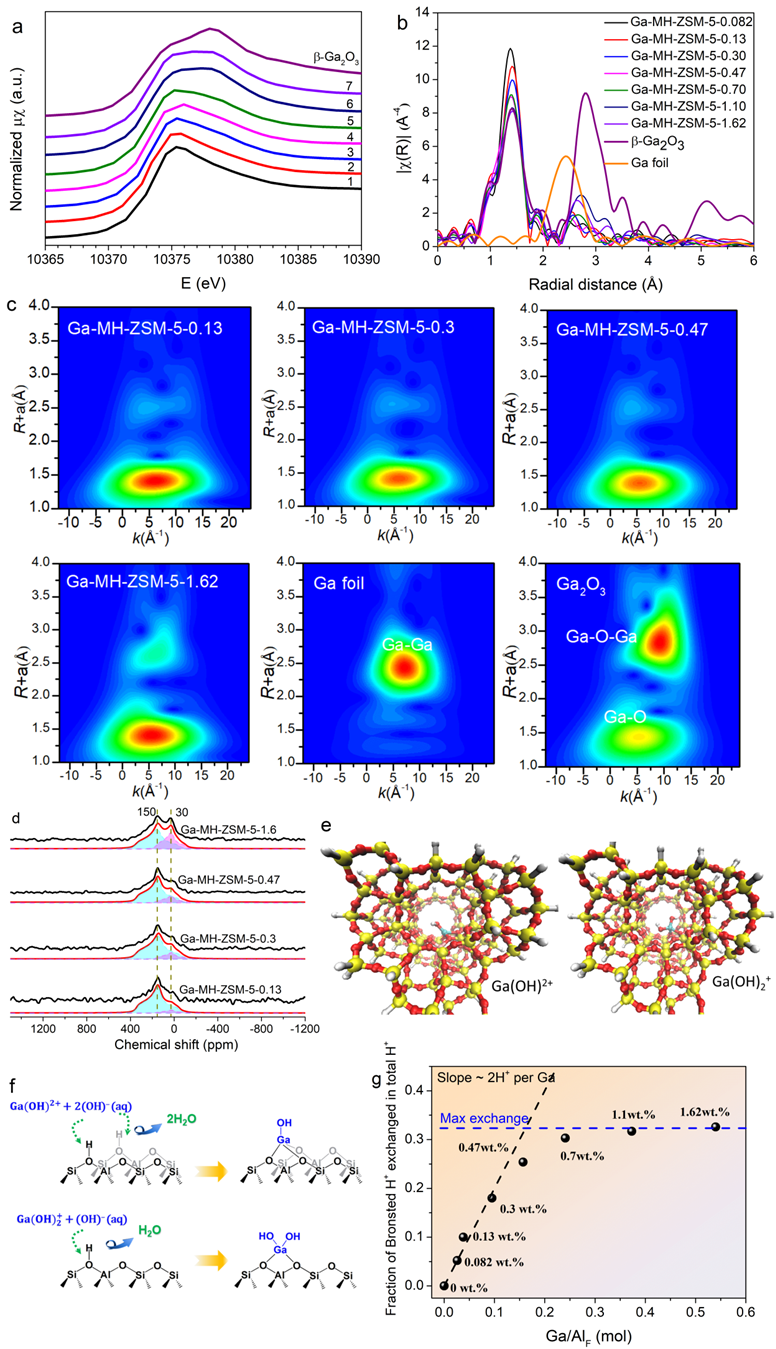 图3. (a, b, c)催化剂的同步辐射表征结果;(d) Ga固体核磁谱图;(e, f) [Ga(OH)]2+和[Ga(OH)2]+物种的理论计算结构模型与形成示意图;(g) 不同Ga负载量与B酸位点的交换度。(论文中出现的Figure 4)