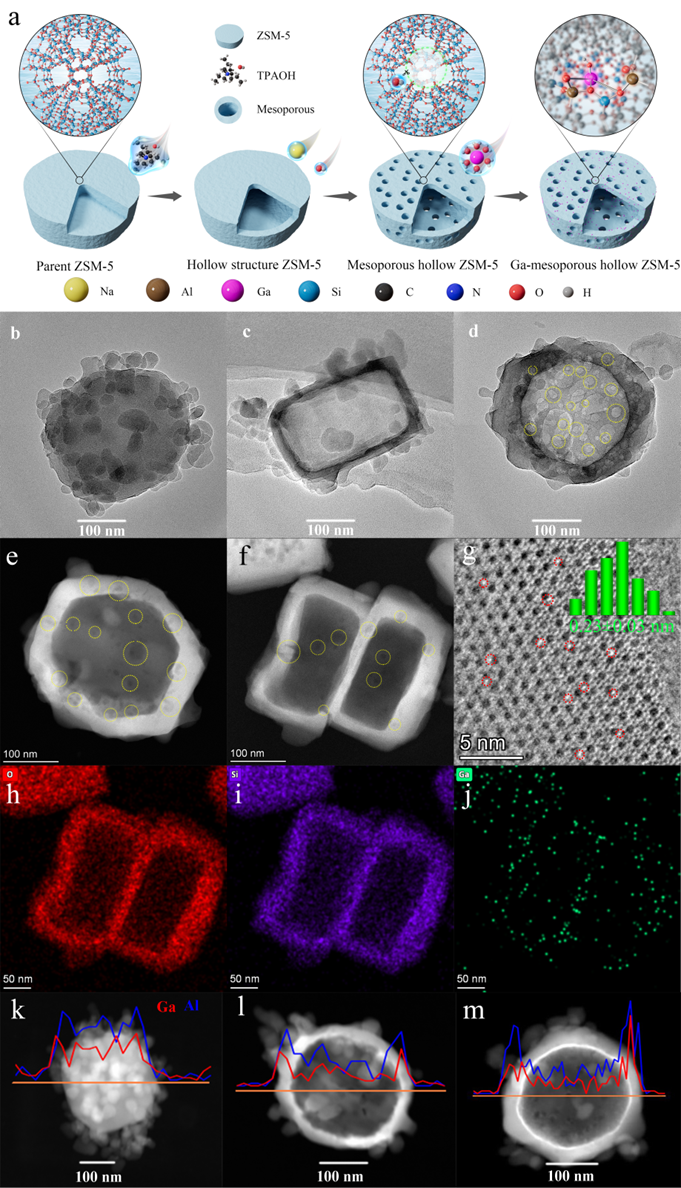 图1. (a) Ga-MH-ZSM-5催化剂的制备过程;(b, c, d, e, f) TEM图;(g) iDPC-STEM图;(h, I, j) 元素分布图;(k, l, m) Ga、Al元素线扫图。(论文中出现的Figure 1)