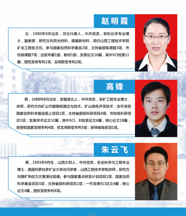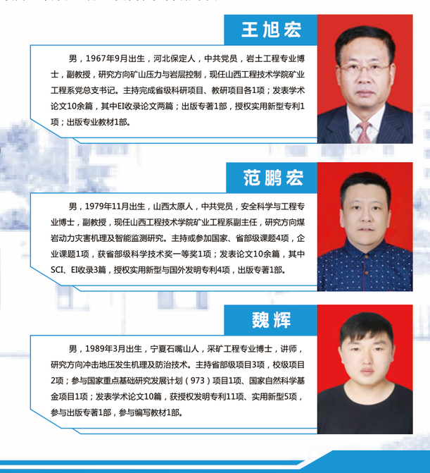 矿业工程系博士团队以煤炭绿色开采与利用为研究课题,围绕国家“碳达峰、碳中和”目标,立足山西省煤炭行业绿色转型发展,致力于煤炭绿色智能安全开采与煤基新材料研制方面的基础理论与应用研究,目前承担国家自然科学基金项目2项、省部级科研项目21项、企业委托项目3项,参与国家级科研项目12项,产出了一批代表性科研成果。