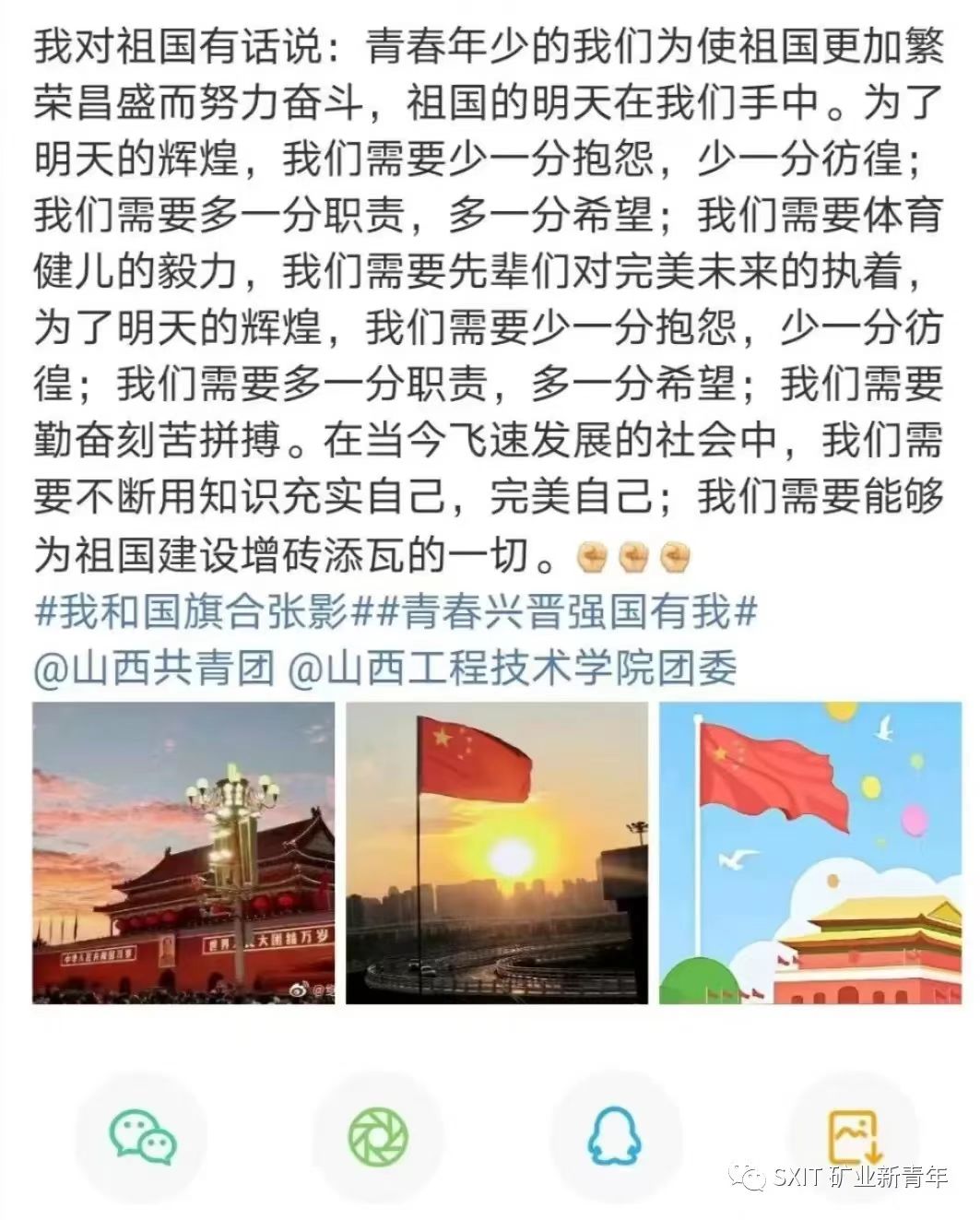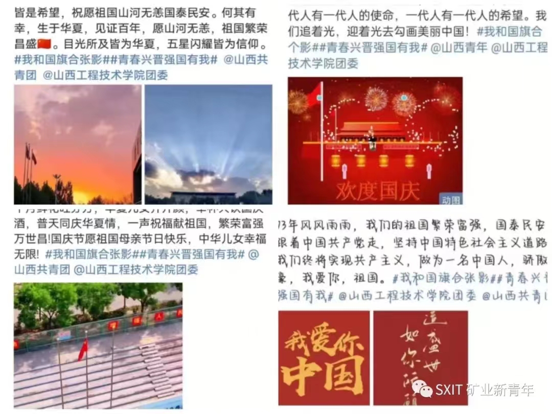 为此,特开展“青春表白祖国”活动。矿业工程系分团委组织围绕“喜迎二十大,深情表白祖国”活动,动员学校学生将自己想对祖国说的话,配图发送新浪微博,加挂相关话题。“筑梦灯火万家,同庆盛世中华”“盼祖国永远山河无恙,烟火寻常”,这都是同学们对祖国真诚热烈的祝福与盼望。同时动员学生录制“爱国手势舞”通过视频表达对祖国母亲的美好祝愿。有同学表演了原创手势舞,用自己的心意为祖国庆生;也有班级集体参与,录制相关视频,用青春洋溢的面貌展示对祖国的热爱与祝福。活动期间,同学们积极参与,用自己的文字和创作表达对祖国母亲真诚的祝福。