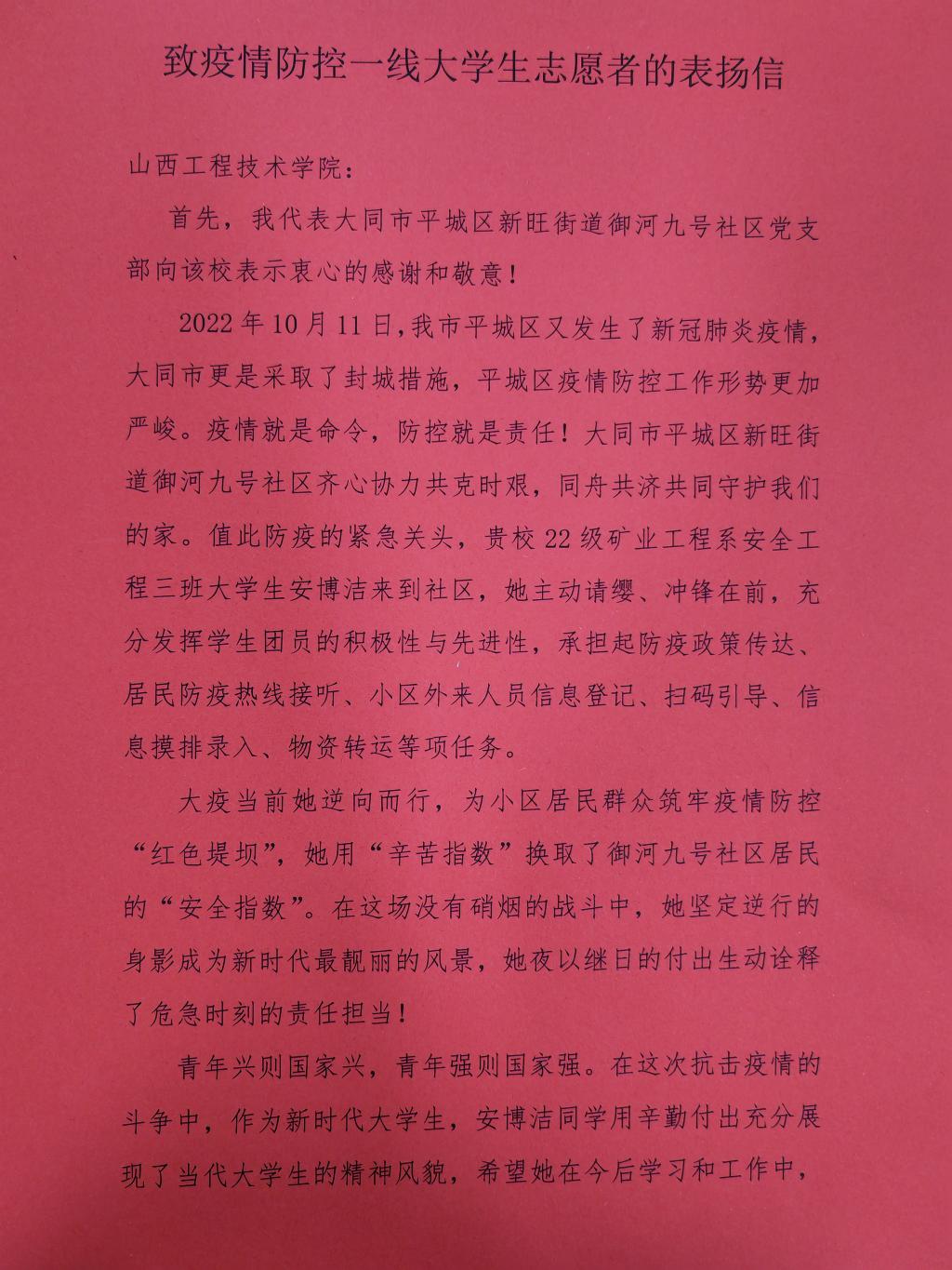 广大党员干部以奔跑的姿态、清零的心态、奋斗的状态,坚守在一线。在社区支部的带领下,我们以“细心"落实举措,换取群众的“放心”;以”耐心”服务群众,换取群众的“舒心”;以“专心”坚守岗位,换取群众的"开心”;以“信心”攻坚克难,换取群众的"安心”。如今,黎明破晓,山河无恙,人声鼎沸,终于迎来了解封之时,有幸收到了社区支部委员会的表扬信;“惟共艰难,方显勇毅。在这场没有硝烟的战"疫”中,无论白天黑夜,无论刮风下雨,身为志愿者的她,总是随叫随到,默默坚守在防疫第一线,核酸筛查时维护秩序,物资保供时挺身而上,寻医问药时守望相助,防疫宜传时爱心守护,便民服务时无微不至……疫情之下,她不辞辛劳、无私付出、不畏风险,共同守护了万家灯火,以实际行动诠释了志愿者的大爱精神。”时代各有不同,青年本该如此!