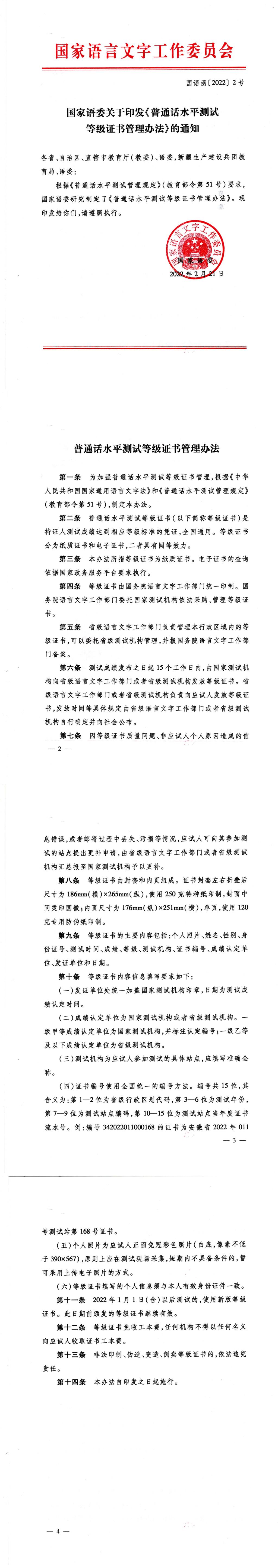 国语函2022[2]号-普通话水平测试等级证书管理办法