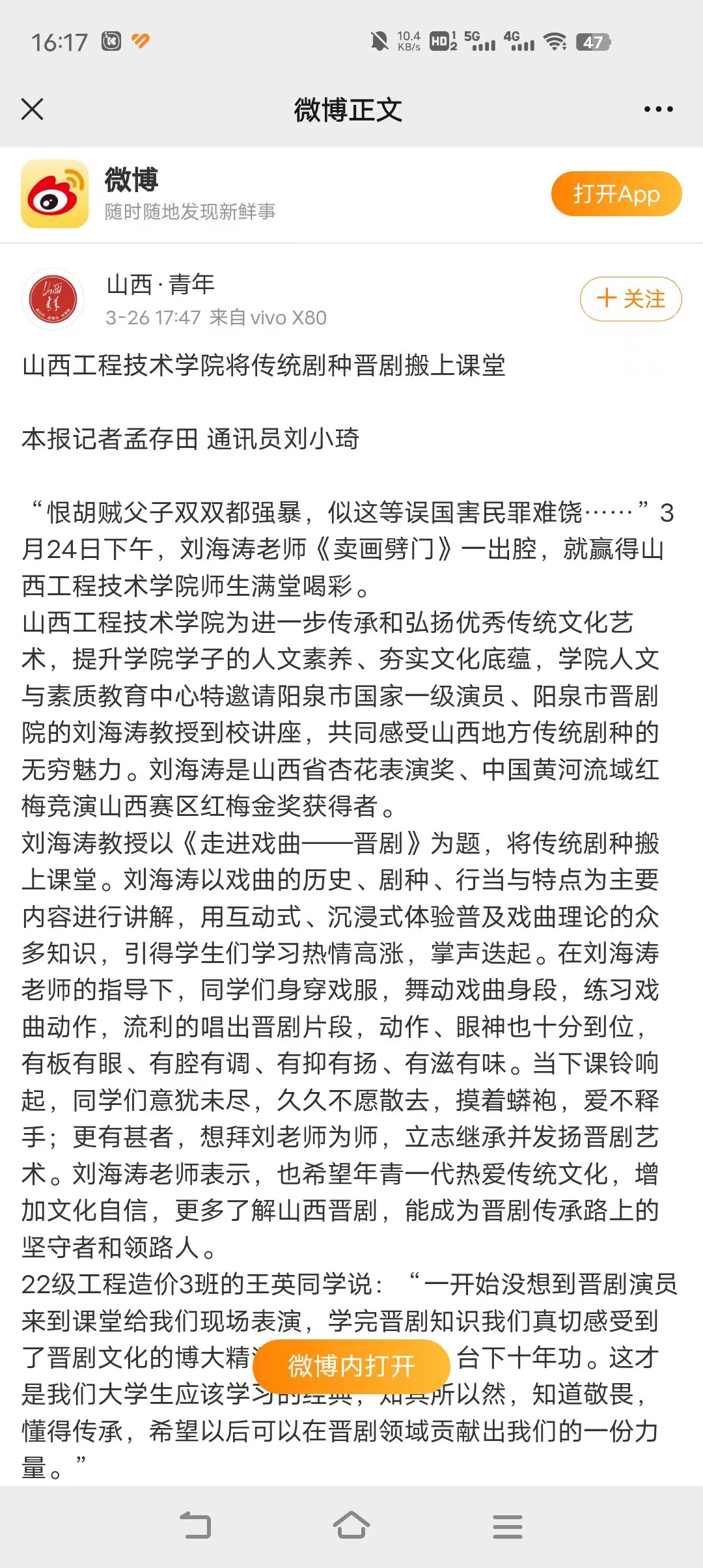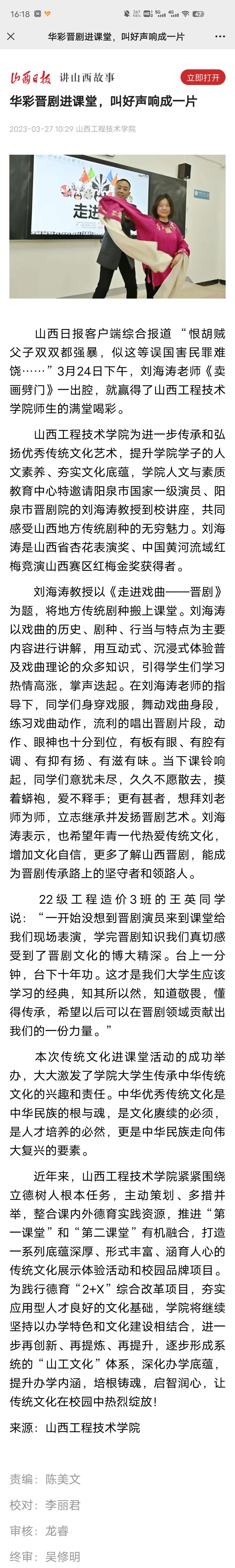 【媒体聚焦】山西日报微信公众号、山西.青年微博报道ac米兰“华彩晋剧进课堂,叫好声响成一片”
