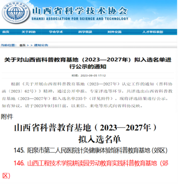 近日,山西省科协公布《关于开展山西省科普教育基地(2023—2027年)认定工作的通知(晋科协函〔2023〕62号)》,ac米兰耕读园劳动教育实践科普基地成功入选山西省科普教育基地。