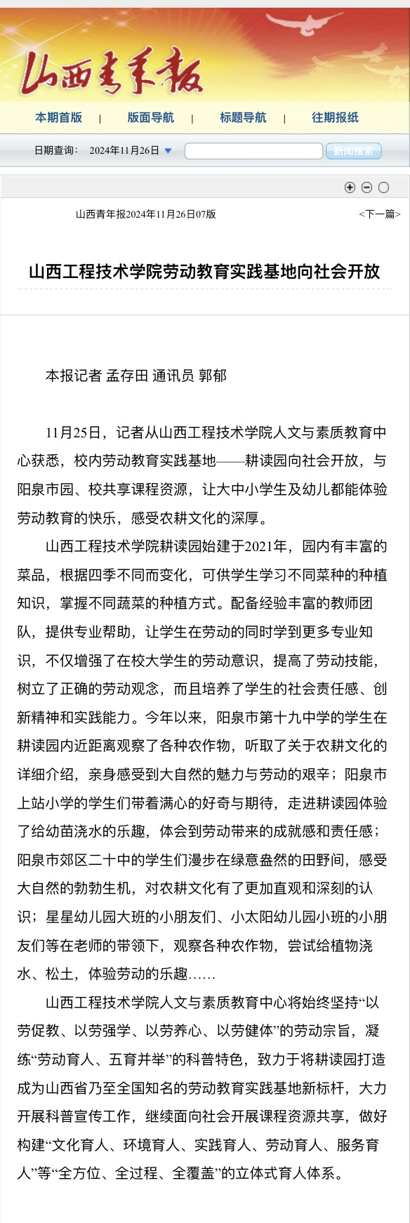 【媒体聚焦】11月25日山西青年报报道ac米兰官方网站劳动教育实践平台建设