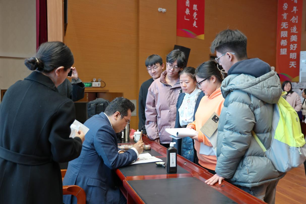 互动环节,气氛热烈。同学们争相提问,刘教授一一耐心点评,并鼓励大家“左手执规,绘就科技蓝图;右手持笔,涵养人文情怀。”台下师生深受鼓舞,不少同学眼神坚定,心中埋下了兼顾专业与人文的种子。讲座尾声,刘教授向我学院师生赠送书法著作《每日一字》。获赠师生们脸上洋溢着喜悦,纷纷表示要认真研读,在笔墨练习中感受书法魅力。
