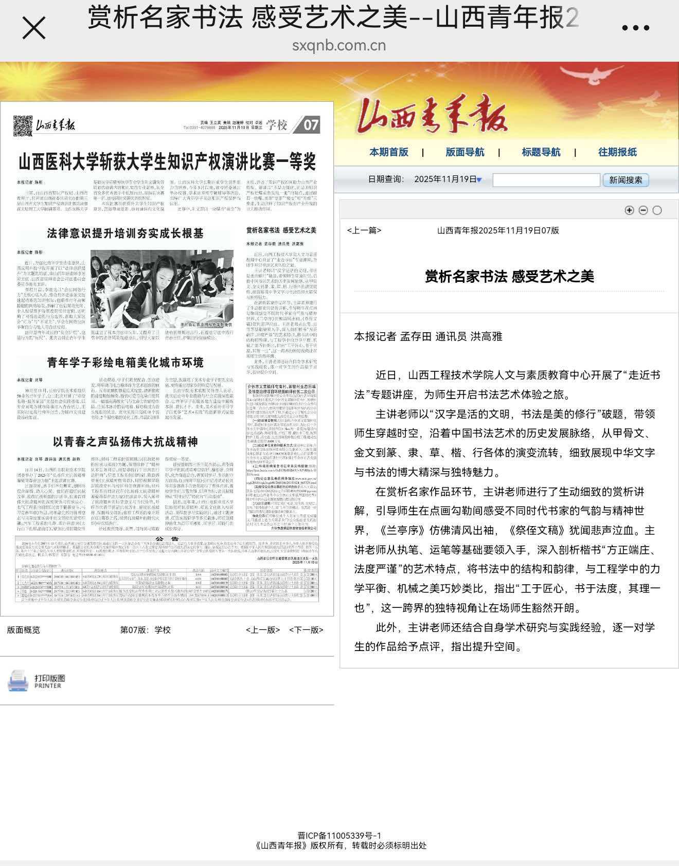 【媒体聚焦】11月19日山西新青年报道ac米兰大美育培根大学生“走进书法”深耕精进