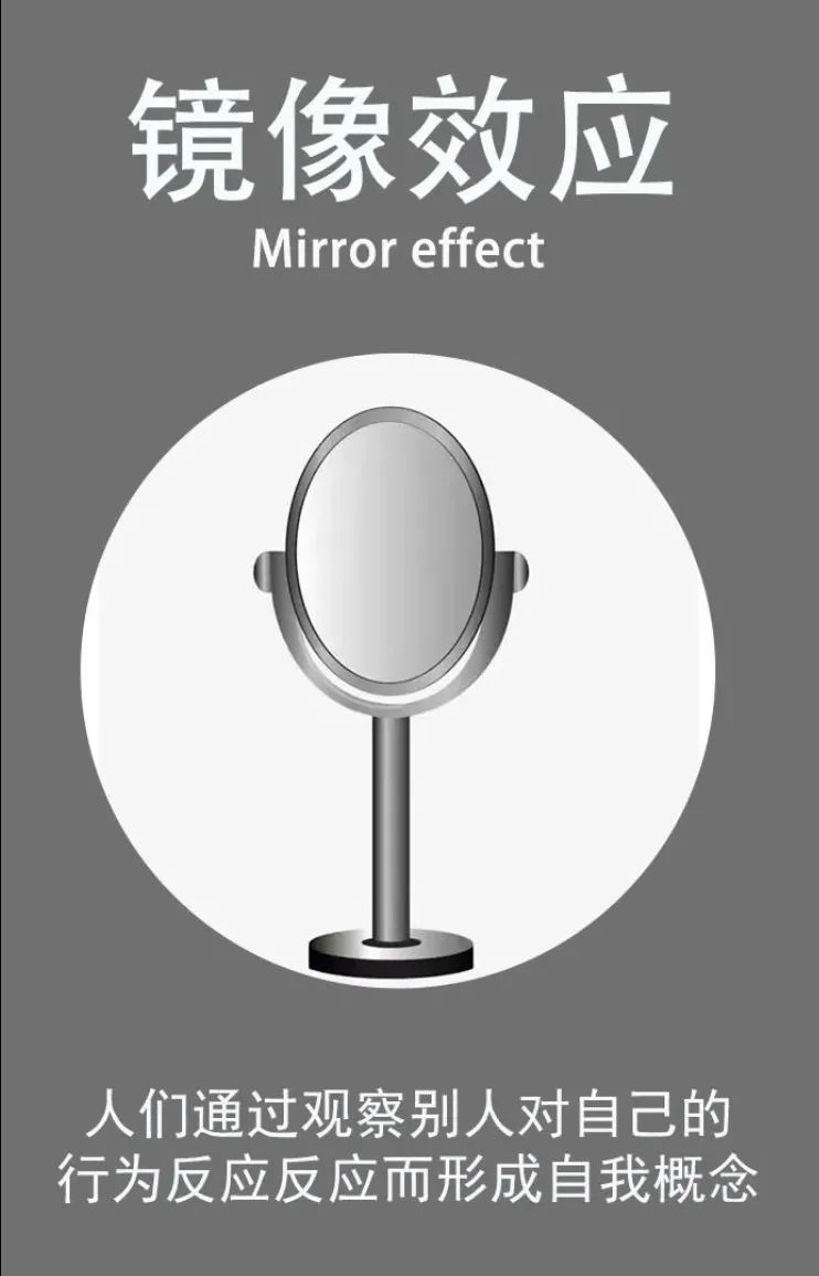 最后,镜像效应即双面镜,你中有我,我中有你。利指出人与人之间相互可以作为镜子,都能照出他面前的人的形象。通过他人的反应,人们能解读他人眼中的我。个体对“镜子”的认知与评估,“镜子”虽然重要,但如何照、如何看也很重要。用“自我”解读过的“我”,使得自己更清楚“我是谁”。“镜中我”还与“镜外我”单面镜子由于光的折射,使得镜中我并不是真正的我,需要多面镜,多角度,才能让真实的我不迷失自我。与人交往,对方是我们自己的镜子,反过来,我们也是对方的镜子,传递积极的信息,能让关系更好,对方反馈过来的认同也同样好。