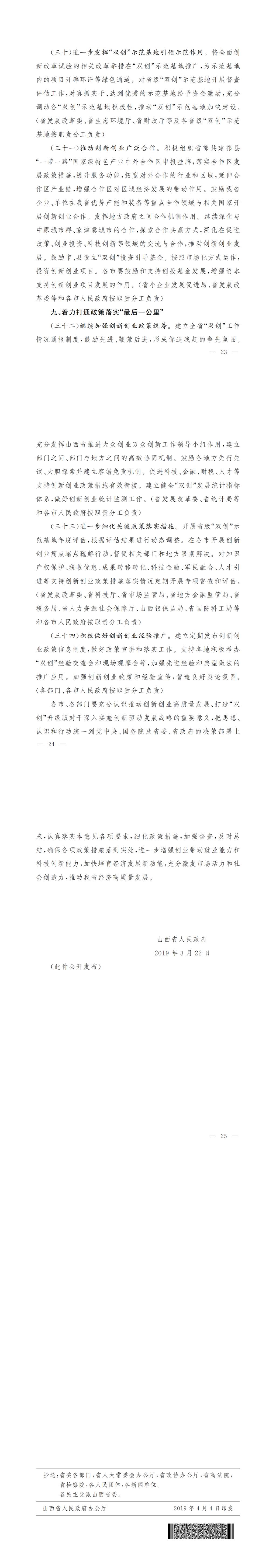 晋政发〔2019〕8号 山西省人民政府关于推动创新创业高质量发展 打造“双创”升级版的实施意见(转发)