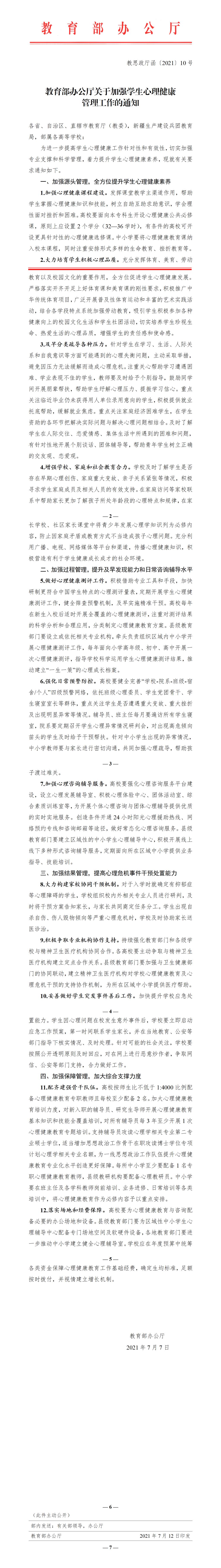 教思政厅函[2021]10号 教育部办公厅关于加强学生心理健康管理工作的通知