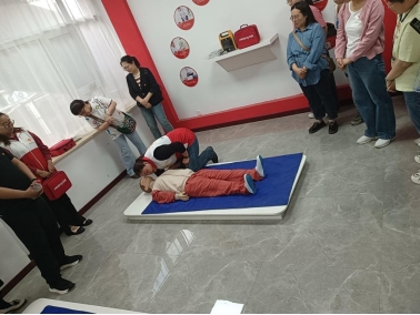 市红十字会发展部部长孙静为大家讲解了红十字运动历史、校园安全VR体验区、社会安全VR体验区、居家安全体验区、模拟烟雾逃生通道、模拟灭火体验系统等体验模块,让大家亲身感受自救互救和逃生避险等专业技能。参观结束后,围绕心肺复苏、AED(自动体外除颤仪)的操作和使用及气道异物梗阻等内容,先理论后实操进行详细讲解和演示。