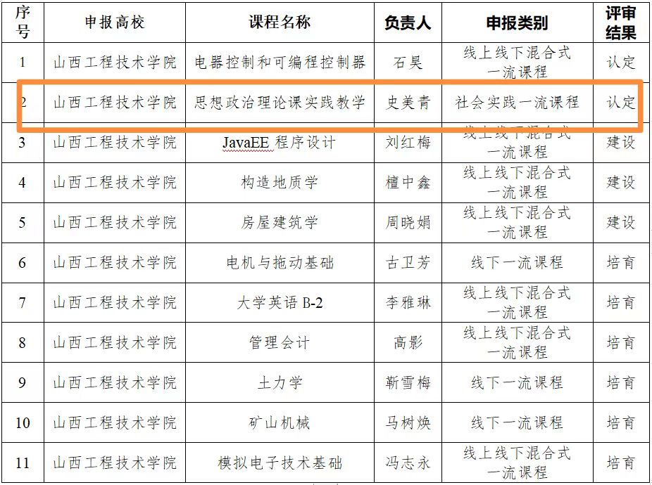 近日,山西省教育厅公示2022年山西省一流课程评选结果,ac米兰共有11门课程获批立项,其中由思政部主任史美青教授领衔申报的《思想政治理论课实践教学》课程被认定为省级一流课程。