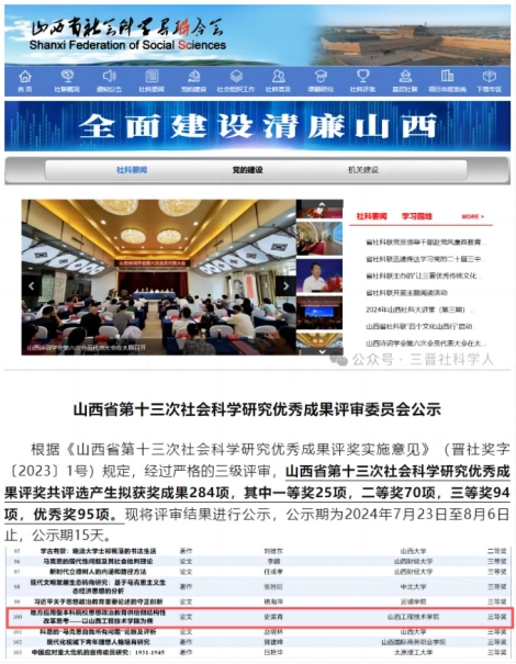 7月23日,山西省第十三次社会科学研究优秀成果奖评选结果公布。思政部史美青教授论文成果《地方应用型本科院校思想政治教育供给侧结构性改革思考——以ac米兰官方网站为例》荣获三等奖。