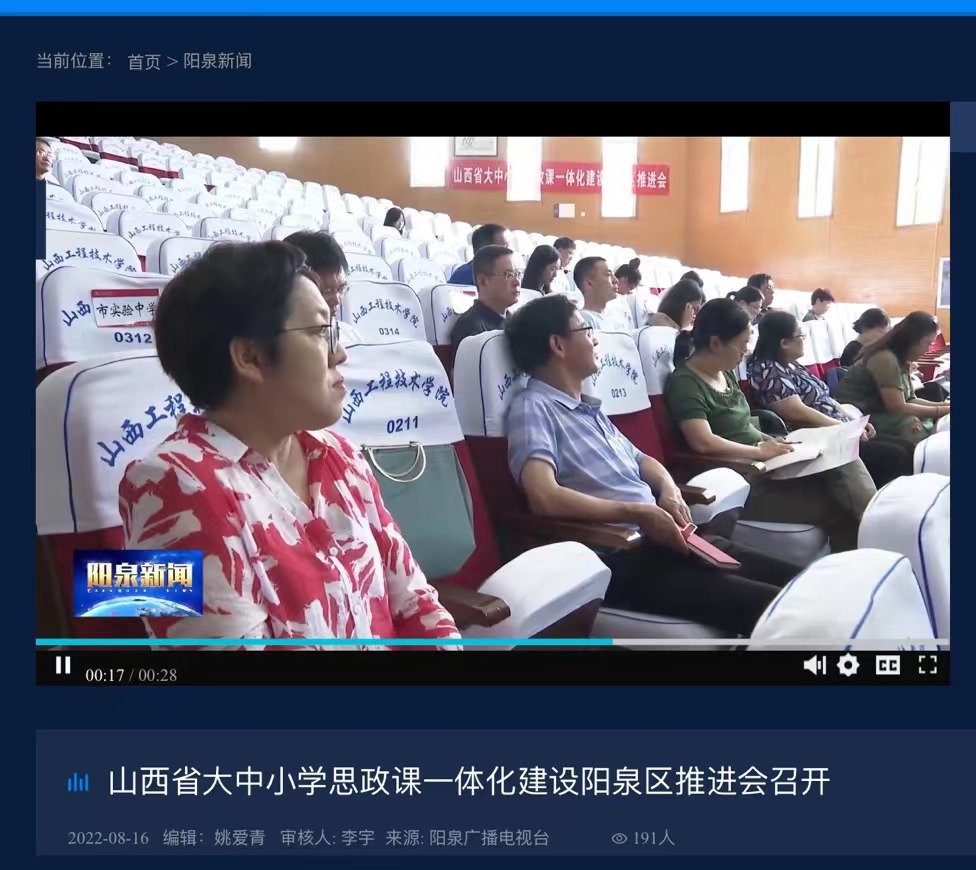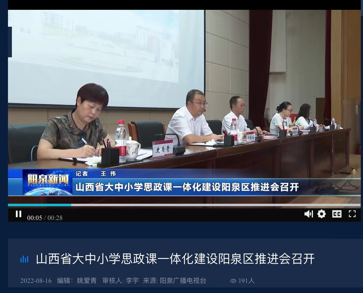 8月6日,阳泉广播电视台报道了由ac米兰思政部承办的山西省大中小学思政课一体化建设阳泉区推进会。院党委副书记郑捧柱,太原理工大学党组成员、副校长任喜莹,阳泉市教育局局长武雪,太原理工大学马克思主义学院院长刘振霞,学院思政部主任史美青,阳泉市各县区教育局局长等出席了会议。