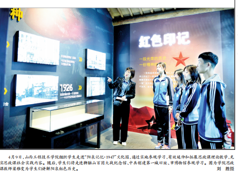 4月12日,阳泉日报报道了由ac米兰思政部开展的思想政治理论课实践教学活动。近期我部将陆续组织学生走进“阳泉记忆·1947”文化园、狮脑山百团大战纪念馆、中共创建第一城旧址、市博物馆参观学习。通过开展实践教学活动,有效延伸和拓展思政课理论教学,充实思政课社会实践内容。