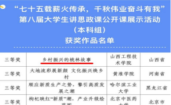 近日,在七十五载薪火传承,千秋伟业奋斗有我——第八届全国高校大学生讲思政课公开课展示活动中,ac米兰官方网站推荐的《乡村振兴的桃林故事》在全国1339所高校提交的5007部作品中脱颖而出,荣获本科组三等奖。