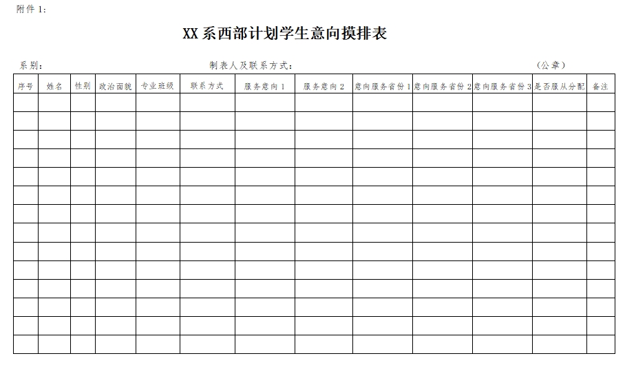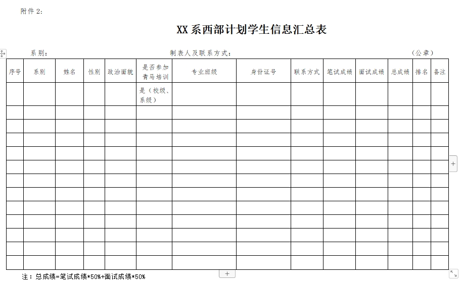 2.笔试面试:各系可制定本系志愿者选拔方案,通过资料信息审核、笔试、面试、心理测试等方式(试题确定后交学院项目办一份备案),以确保对报名者的政治思想素质、心理素质、学习成绩及志愿服务经历等关键信息进行全面、客观、公正的考察。笔试面试结束后,于5月28日之前将《大学生志愿服务西部计划报名登记表》和信息汇总表(附件2)交学院项目办。