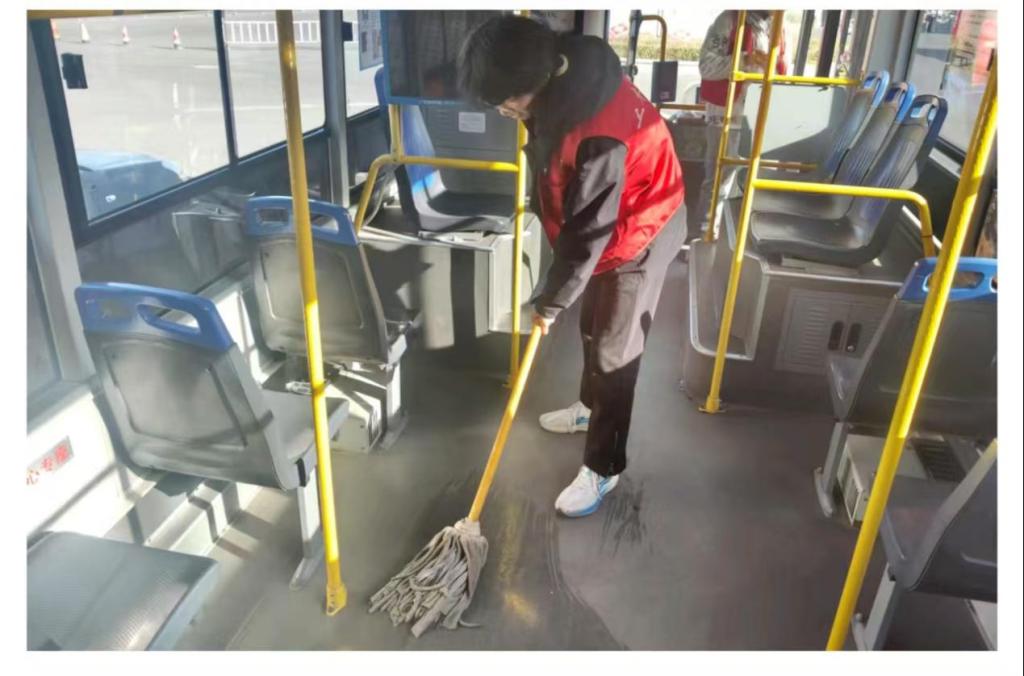 到达车站后,负责人将志愿者分成几个小组,每组负责一辆公交车。车厢内的座位、扶手、地板,以及车窗,都是他们要清理的对象。在上一组清扫完成下车后,下一组志愿者便上车开始拖地,大家分工明确,互相配合,高效的完成了清扫任务。