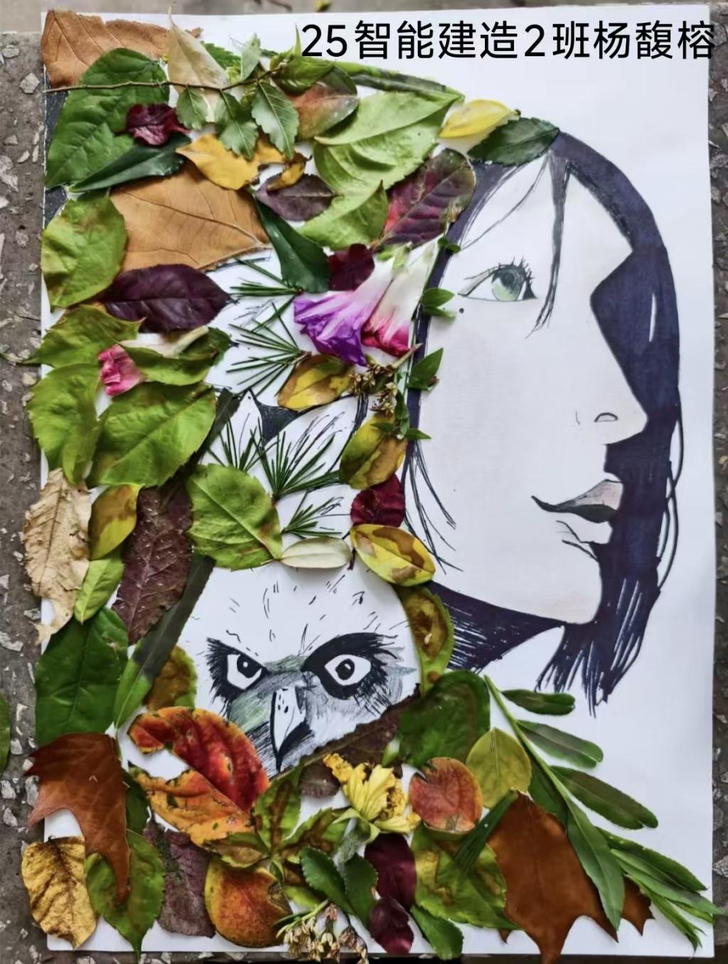 同学们在收集过程中,不仅用眼睛观察,更用心去感受。随后,他们充分发挥自己的创意,以拼贴的形式开启创作之旅。有的作品如同灵动的画卷,用落叶的斑斓色彩定格了秋日的绚烂,让人仿佛置身于一个五彩斑斓的童话世界;有的作品则似一首无声的诗,借叶脉的纹理传递出细腻而深沉的情感,引发观者内心深处的共鸣。每一件作品都像是一颗独特的种子,凝结着创作者对自然的细致观察与对生活的深刻感悟,成为心灵与自然对话的独特载体,在同学们的手中逐渐绽放出创意的光彩。