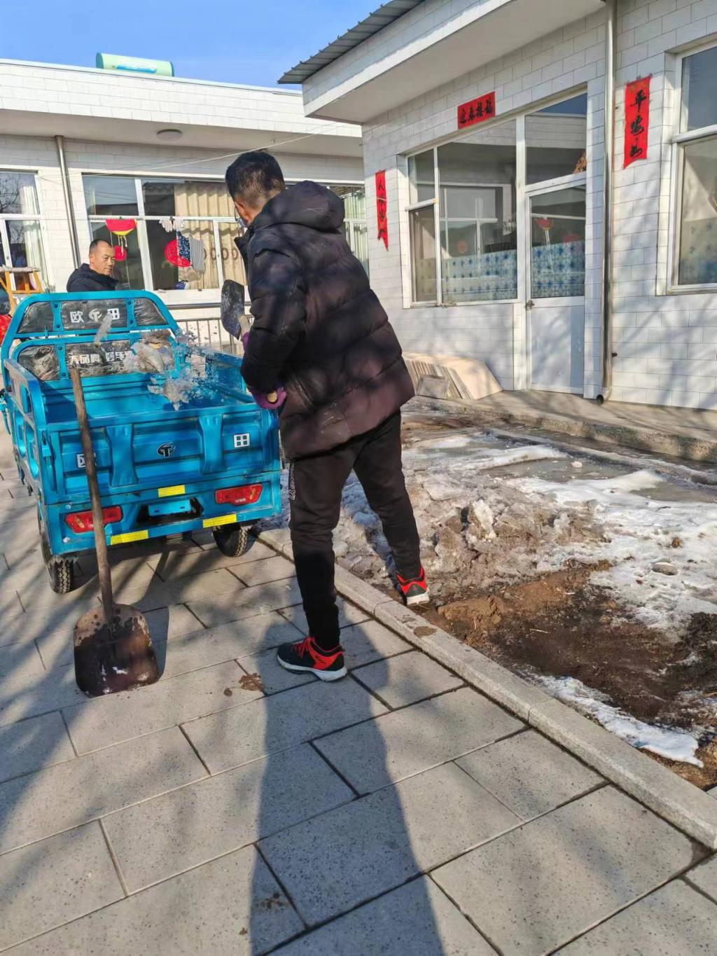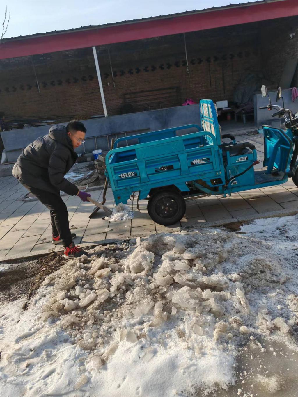 今年冬天降雪量倍增,村里许多地方都堆满了积雪,长此以往易造成道路结冰影响出行。所以我志愿去清理大院,街道两旁所残留的积雪。用铁锹将积雪装车再由专人开三轮车送到指定地点。清除工作难度较大,有很多积雪融化后再次结冰使积雪牢牢固定在了地面。功夫不负有心人,经过几天的破冰行动,虽然没有将冻冰彻底清除,但已不会妨碍道路交通,村民出行也更加安全。