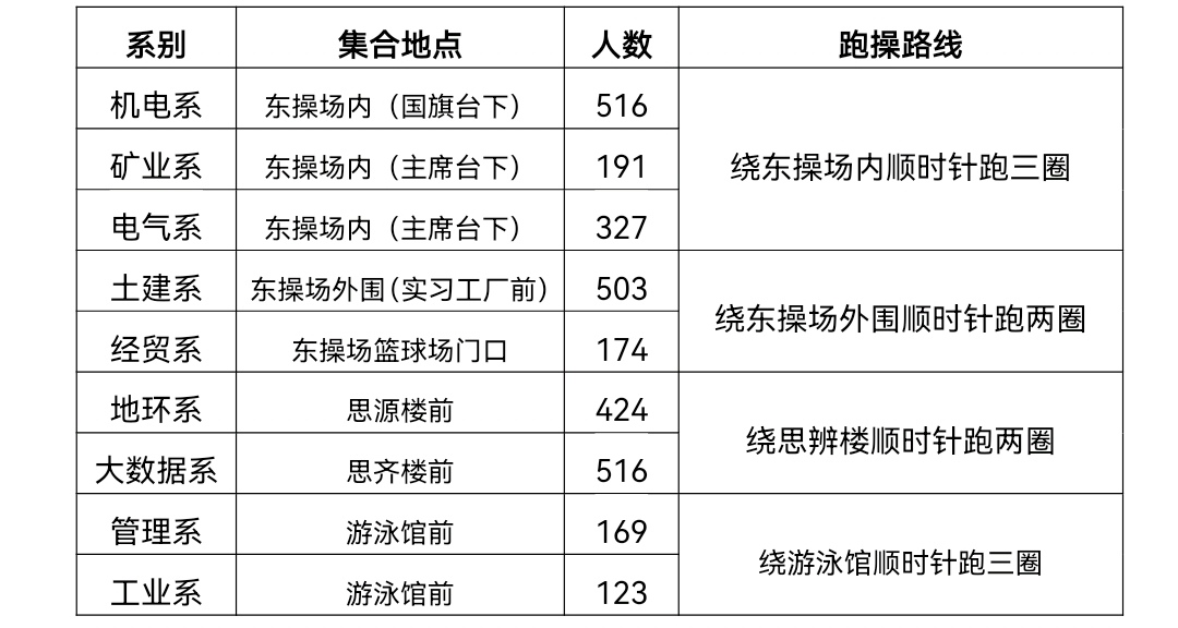 2.为了方便组织、管理、清点人数,请各系到指定地点集合、跑操。