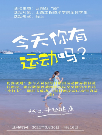 活动时间为3月30日-4月16日,参与人员需每日借用运动世界校园进行跑步,跑步数据以截图形式提交至微信小程序“小打卡”,即打卡成功。(每日跑步以1.5公里为基准)