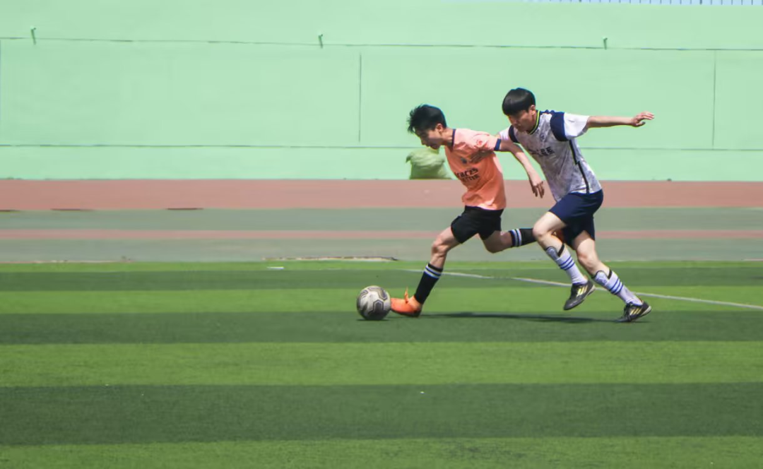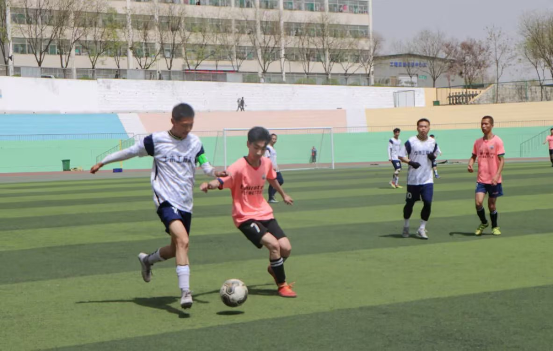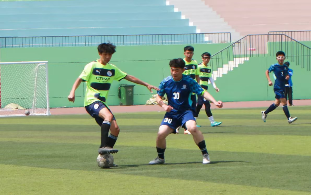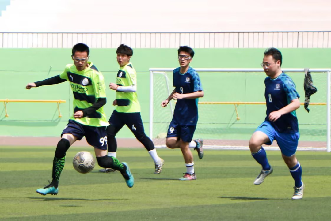 4月19日半决赛第二场比赛双方为机械系和大数据系,赛前球员们在进行热身运动,双方球员相互击掌问候,以示友好。比赛正式开始,双方球员素质过硬,连续带球过人,且团队意识很强,两队球员空中接球的精彩场面,引得现场观众连连叫好,在机械系10号球员刘代鹏向对方球门冲去时,大数据系球员防守严密,这导致机械系进攻失败。