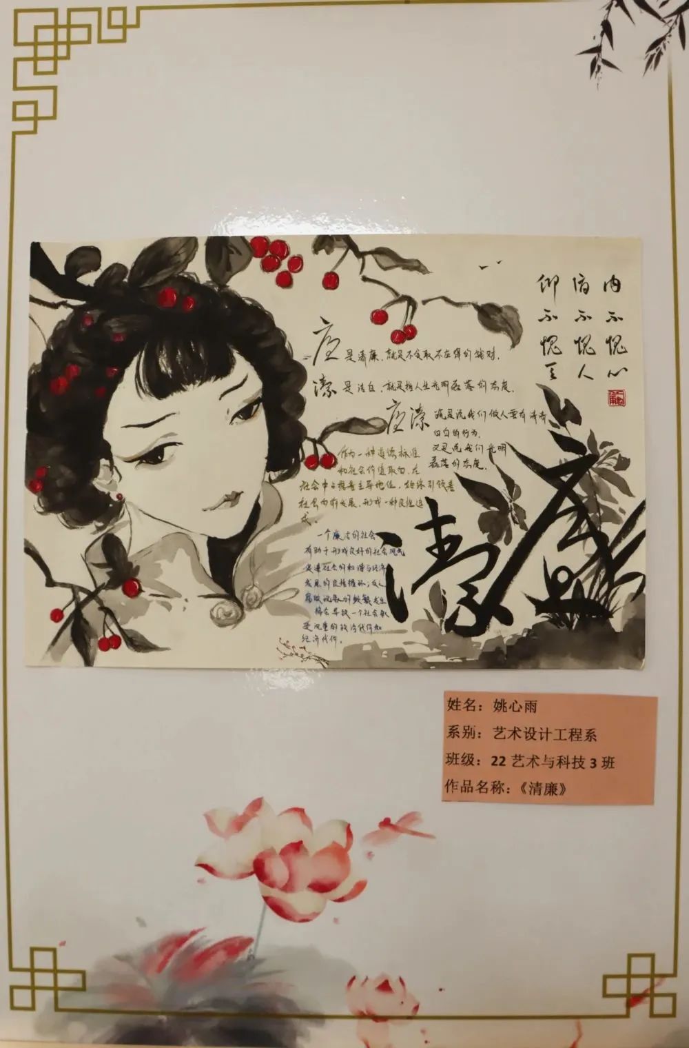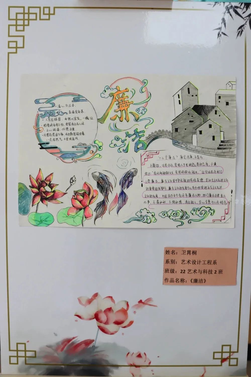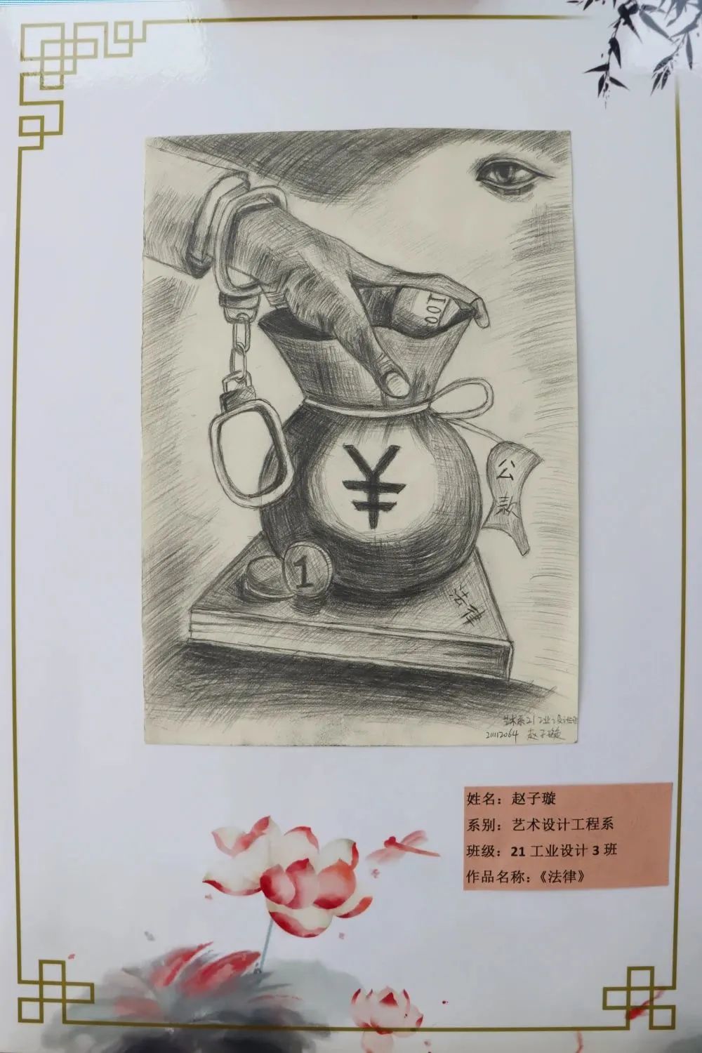 活动中,卫霄桐的《廉洁》、赵子璇的《法律》、徐子丹的《廉洁文化》、陈瑞英的《清正廉洁》、曹晓影的《廉洁—追悔莫及,悔之晚矣》、王朝阳的《莲》、孙悦然的《清廉》、王磊的《悬高镜明》等优秀绘画作品,通过正面引导、反面警示的意境表达,让青年学子感悟蕴含其中的廉洁文化。