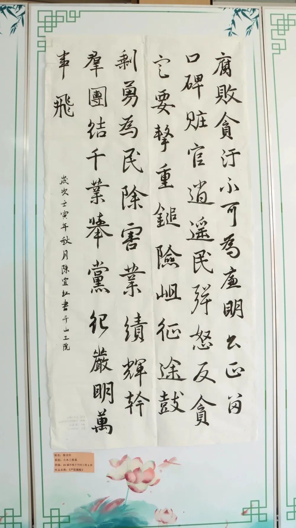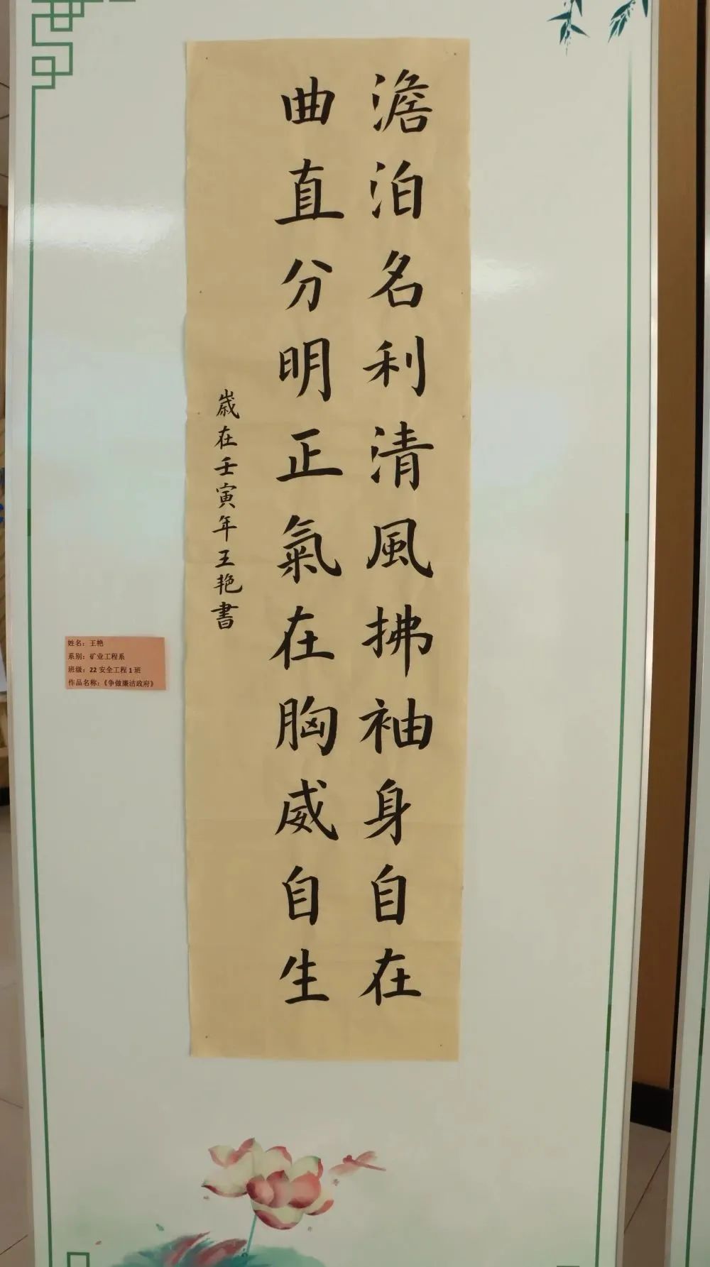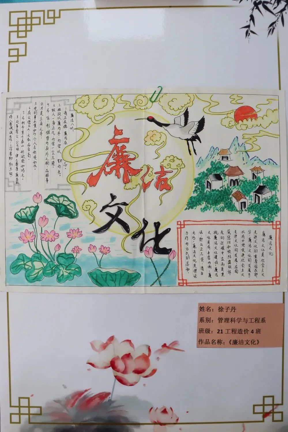 活动中,卫霄桐的《廉洁》、赵子璇的《法律》、徐子丹的《廉洁文化》、陈瑞英的《清正廉洁》、曹晓影的《廉洁—追悔莫及,悔之晚矣》、王朝阳的《莲》、孙悦然的《清廉》、王磊的《悬高镜明》等优秀绘画作品,通过正面引导、反面警示的意境表达,让青年学子感悟蕴含其中的廉洁文化。