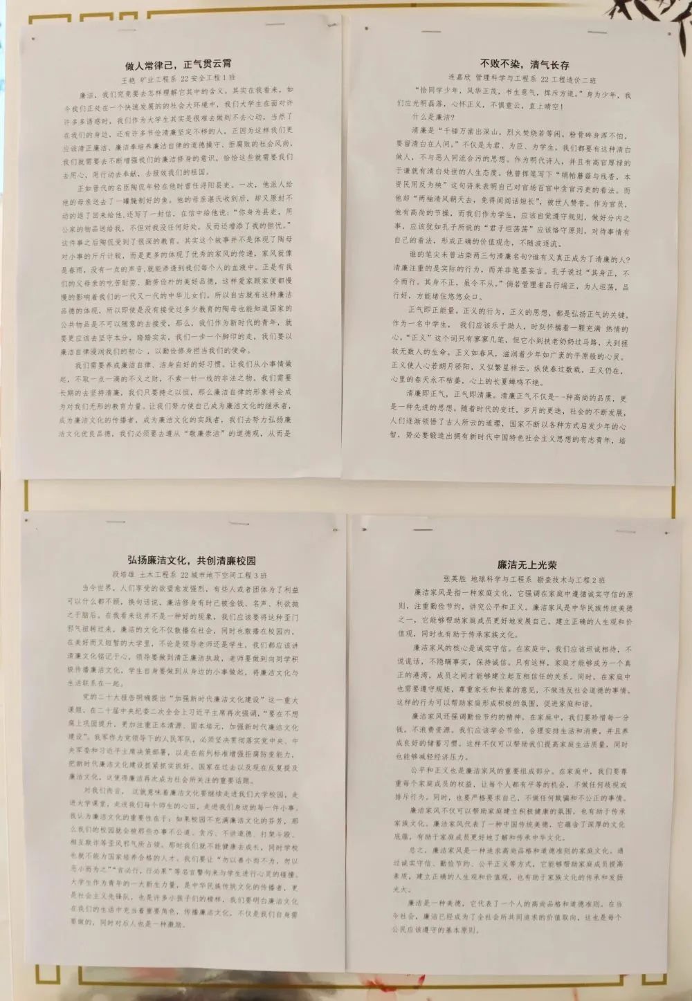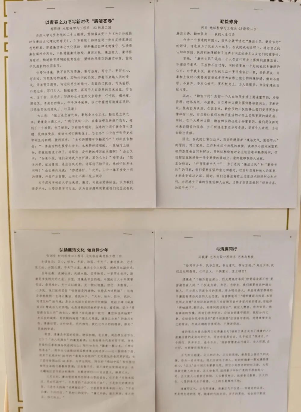 王艳的《做人常律己,正气贯云霄》、连嘉欣的《不败不染,清气长存》、段培雄的《弘扬廉洁文化,共创清廉学校》、张英胜的《廉洁无上光荣》、郝雨轩的《以青春之力书写新时代“廉洁答卷”》、何炎的《勤俭节约—我的人生信条》、张润华的《弘扬廉洁文化,做自律少年》、闫毓豪的《与清廉同行》,通过征文的形式,表达廉洁之意,讲述廉洁故事,增强青年学子的廉洁意识。本次作品展是学院学工部和团委联合开展的大学生廉洁教育系列活动之一,旨在以推进全面从严治党为主线,对标全面建设清廉山西的目标任务和工作要求,通过学院的“五大工程”促进学生自觉廉洁修身,增强学生廉洁意识,营造学生“学在山西、干在山西、施展才华在山西,成就事业在山西”的浓厚氛围。