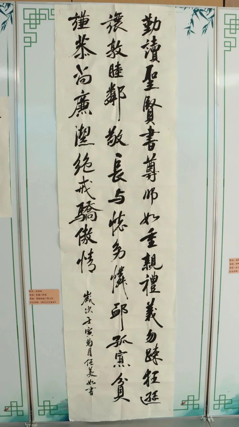 戴永琪的《诗魂今之廉洁》、李光辉的《石灰吟》、陈宣红《严惩腐败》、赵晓宇的《两袖清风》、任美如的《范文正公家训》、张伟振的《咏廉政》、赵龙的《惠风和畅》、王艳的《争做廉洁政府》,通过墨色浑厚醇美,墨迹淋漓,质感丰富,遒劲有力的笔画,表达了他们敬廉崇洁的价值观念。