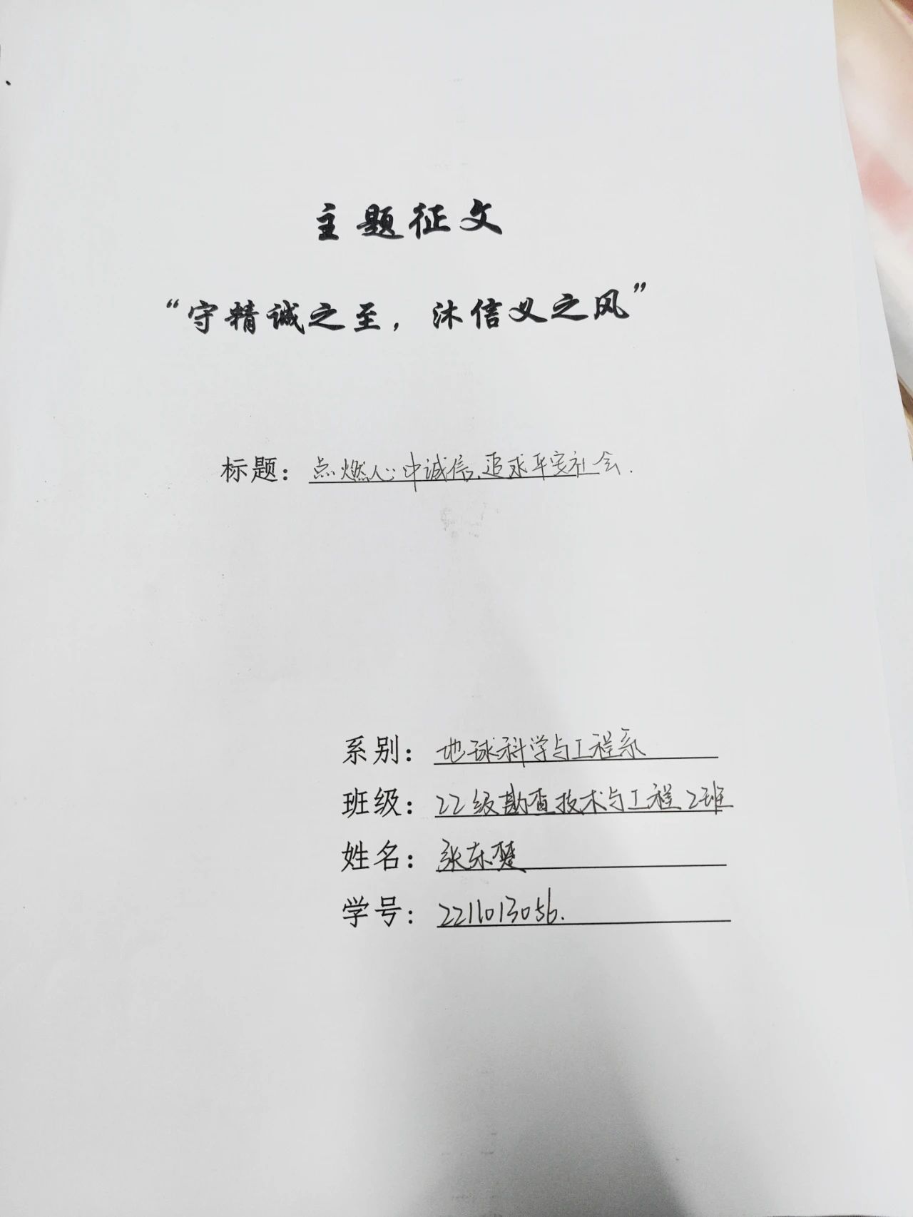 为培养学生的诚信意识,创造良好的校园文化氛围,使学生成为有理想、敢担当、能吃苦、肯奋斗的新时代好青年。大数据与智能工程系联合地球科学与工程系特以“守精诚之至,沐信义之风”为主题开展此次征文活动。