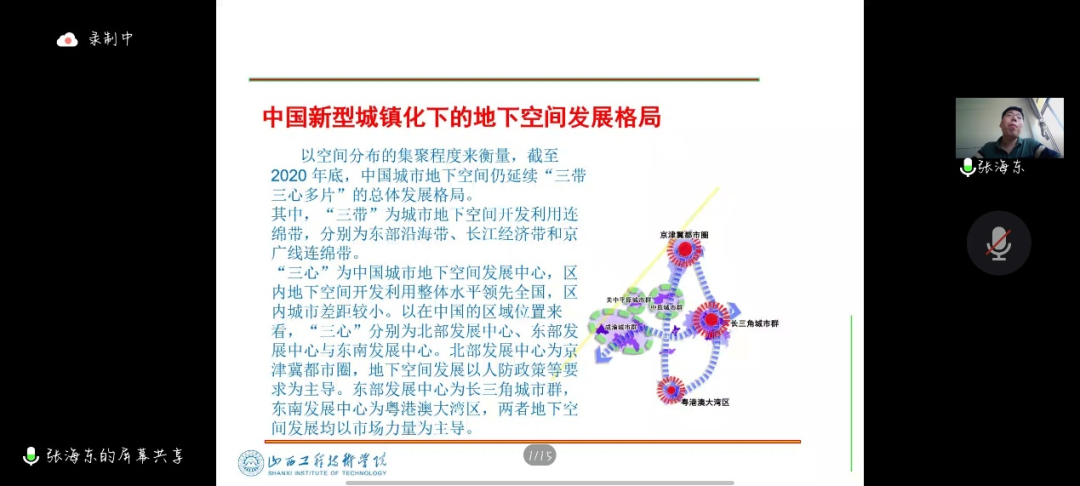 首先,主讲教师张海东老师全面的介绍了城市地下空间工程专业的前沿发展,其中包括中国新型城镇化下的地下空间发展格局和地下空间行业与产业分类。之后具体阐述了“三带三心多片”总体发展格局的相关知识,用一些数据图展示出城市地下空间工程的中国速度,特别是“十三五”期间,中国地下空间产业体系已显示出强大的市场潜力。随后,张海东老师介绍了“城市地下空间工程”专业的毕业生规模、毕业从事方向、薪酬水平以及专业课程。