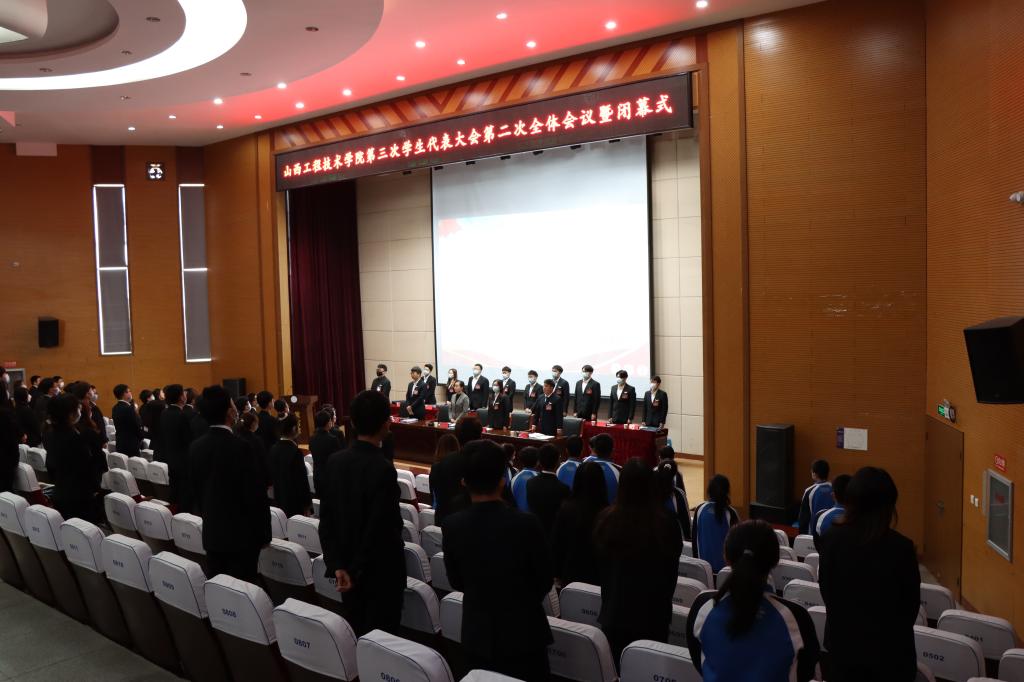 在闭幕式上,院团委书记马秀叶代表院团委致辞。她说,本次会议在院党委、团省委和省学联的亲切关怀下,在各系党总支、院团委和分团委的关心与指导下,经过与会代表的共同努力,圆满完成了既定任务,与会代表及各级学生会组织要统一思想,紧扣时代主题,围绕学院中心工作,在新的征程中,续写新的篇章。并提出三点要求:一要坚定理想信念,二要练就过硬本领,三要主动担当责任。希望全院各级学生组织要团结带领全院青年学生在实现中华民族伟大复兴的中国梦中矢志奋斗,在学院高水平应用型本科建设中奉献力量,在学院评建工作中做出应有的贡献!