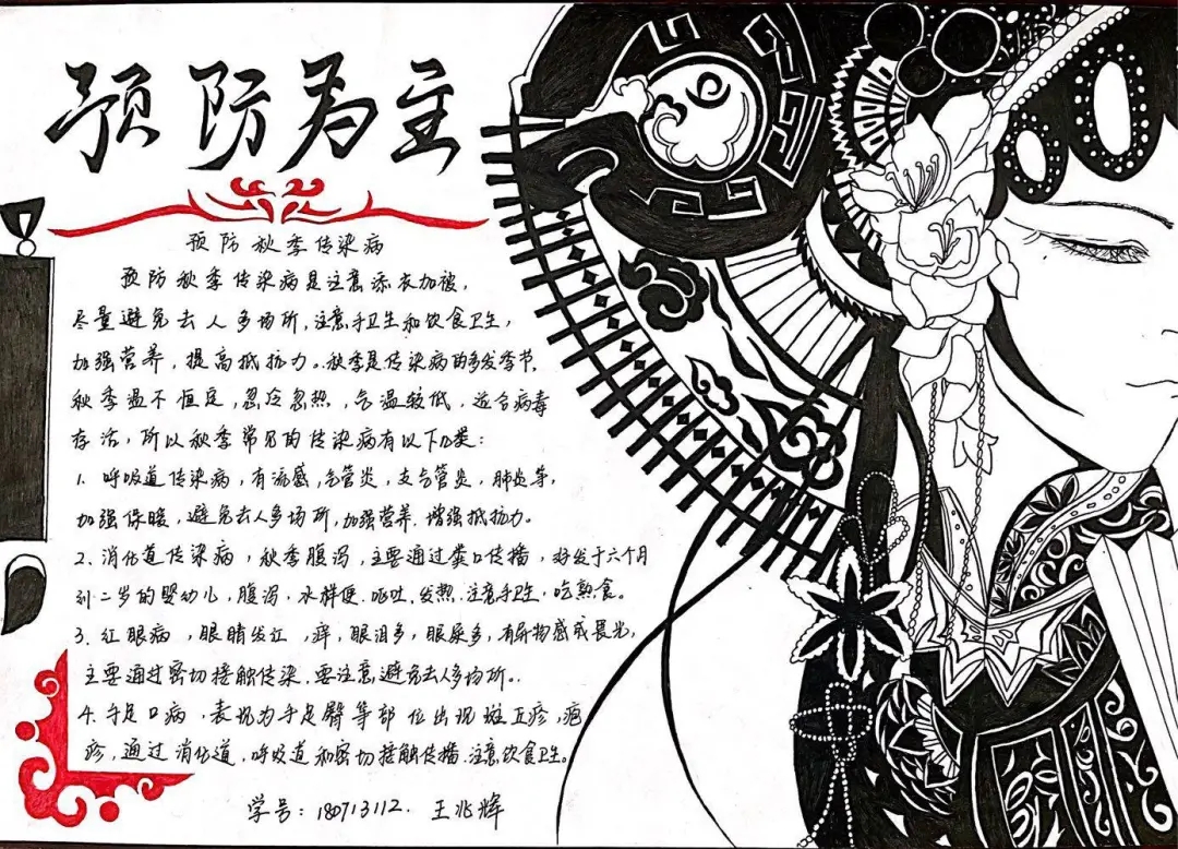同学们结合自身兴趣好,发挥特长优势,积极参加秋季传染病知识的手抄报和征文比赛,在作品征集过程中,共收到228份有关“预防秋季传染病”的手抄报或者征文作品,极大的展现出了同学们参与预防秋季传染病活动的热情。本次活动共评选出了一等奖3份、二等奖6份、三等奖10份和优秀奖作品13份。
