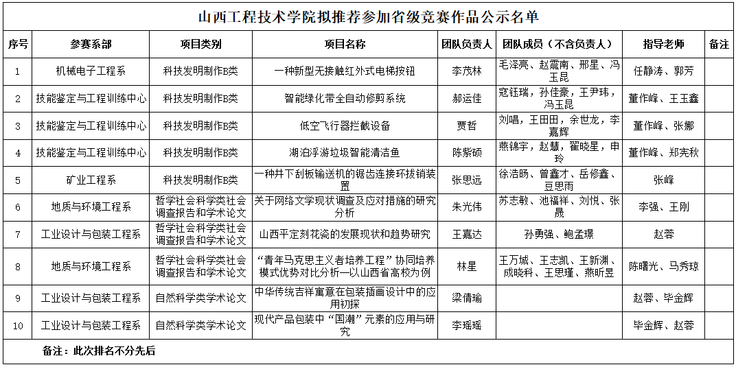 院团委于2021年3月31日举办ac米兰官方网站“挑战杯”课外学术科技作品竞赛决赛,经校级专家交叉匿名评分和专家现场评审等环节,最终评选10件作品拟推荐参加山西省第十七届“兴晋挑战杯”大学生课外学术科技作品竞赛。现将拟推荐作品予以公示(公示名单见附件)。