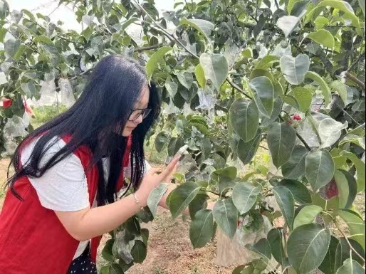 步入这片生机盎然的种植基地,一列列笔直挺拔的梨树在眼前矗立,它们散发出清新宜人的果香,这是大自然最纯粹无私的馈赠,同时也是乡村振兴壮丽篇章中最为动人心弦的旋律。基地的负责人向团队成员详细阐释了玉露香梨从幼苗时期的精心呵护至生长周期的科学调控,团队成员深刻体会到,每一份细致入微的照料都凝聚着果农们辛勤耕耘的汗水,倾注着他们对这片土地和果树的深厚情感。期间,实践团成员们亲眼目睹了果农们忙碌而有序的身影。他们或手持剪刀,专心致志地修剪枝叶,确保每一株植物都呈现出最佳的形态;或肩扛农具,一丝不苟地进行施肥灌溉,确保梨树得到充分的营养与水分。他们的每一个动作都彰显着对种植工作的热爱与专注。实践团成员积极协助果农,对梨树旁的杂草进行了认真的清理,并参与了梨子套袋的农业实践活动。在此过程中,成员们深刻体会到了保护果实、促进品质提升的重要性,展现了高度的责任感和积极的工作态度。